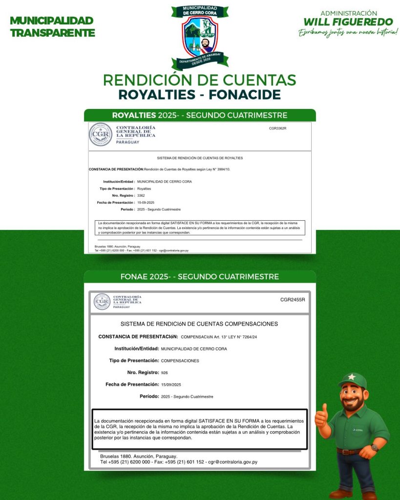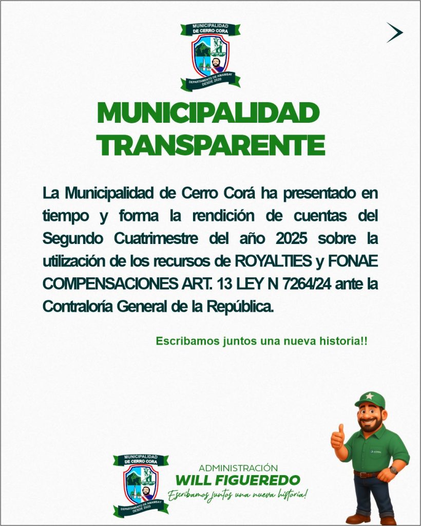 La Municipalidad de Cerro Corá, cumpliendo con la normativa vigente y en el marco de la transparencia en la gestión pública, presentó en tiempo y forma ante la Contraloría General de la República la rendición de cuentas correspondiente al Segundo Cuatrimestre del año 2025, sobre la utilización de los recursos provenientes de Royalties y FONACIDE – Compensaciones (Art. 13, Ley N.° 7264/24). 🇵🇾